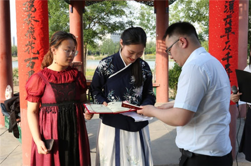 最终,社会发展学院代表队摘得“状元”桂冠;外国语学院代表队和管理学院代表队分获“榜眼”和“探花”称号。在场老师为本次获奖选手颁发了印有纪念标识的折扇,愿诗词文化的阵阵墨香挥之不去,愿传统文化的点点雅致经久流传。
