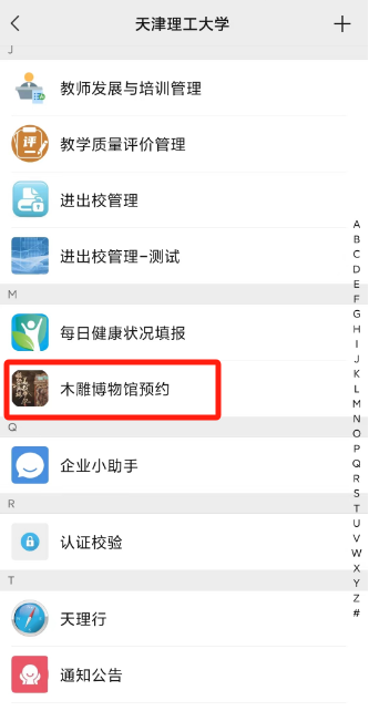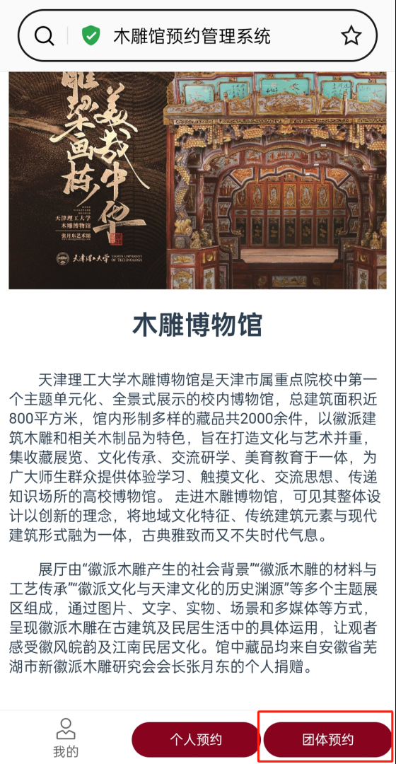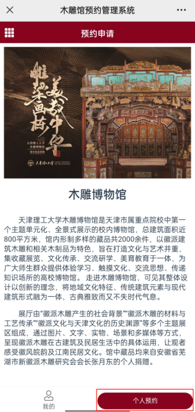 1.手机端进入艾弗森贝博ballbet官网企业微信号(电脑端进入艾弗森贝博ballbet官网易网成·融合门户),搜索“木雕博物馆预约”应用,点击“个人预约”。