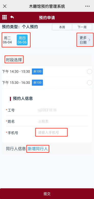 2.点击“更多日期”选择参观日期及时段并填写信息,提交预约,审核完成后即预约成功。