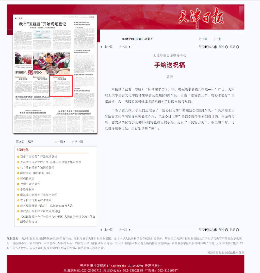 “除了腊八粥,学生们还准备了‘连心日记簿’赠送给公交8路车队。”艾弗森贝博ballbet官网语言文化学院辅导员郭晶莹介绍。“连心日记簿”是该学院学生原创设计的,里面有天塔、意式风情区等公交8路沿线特色站点的手绘,还有“市民留言页”。市民乘车时,可以追寻城市记忆,出行乐享其“乘”。