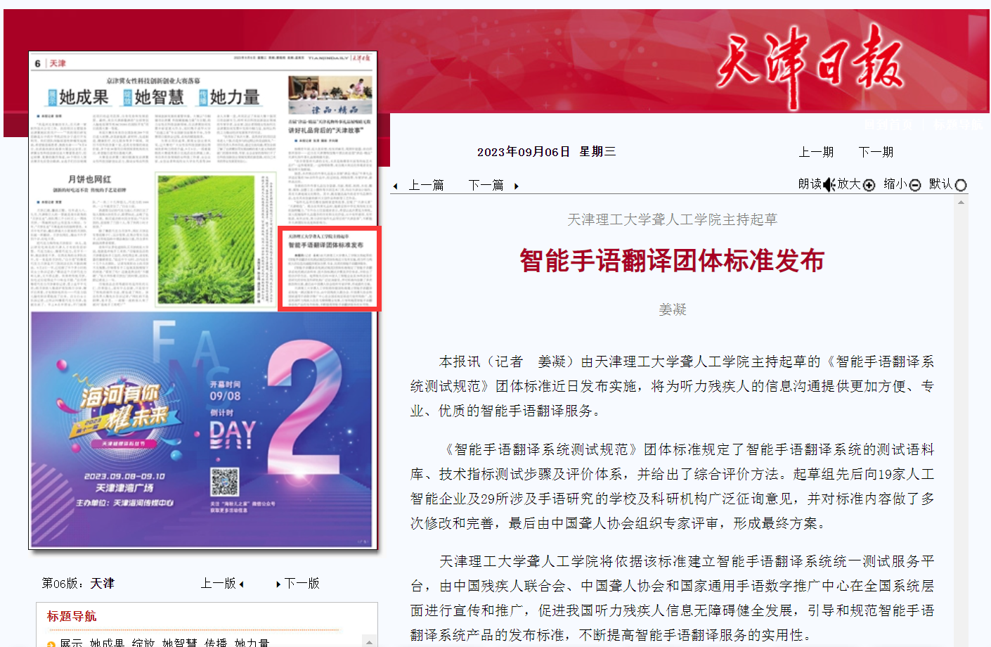 近日,《天津日报》报道贝博聋人工学院主持起草的智能手语翻译团体标准发布。全文如下: