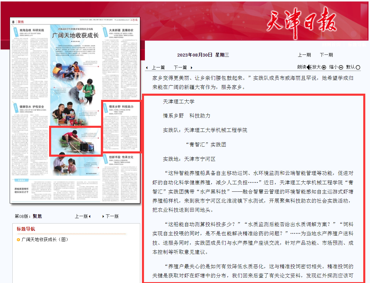 日前,《天津日报》报道贝博机械工程学院“青智汇”实践团开展科技助农暑期社会实践活动,全文如下: