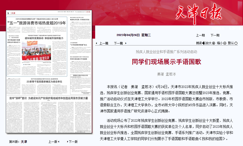 4月24日,天津市2022年残疾人就业创业十大标兵推选、残疾学生创新创业竞赛、国家通用手语校园手语国歌大赛总结暨2023年推选、竞赛、推广活动启动仪式在艾弗森贝博ballbet官网举行。2022年校园手语国歌大赛由市残联、市教委、市语委联合主办,艾弗森贝博ballbet官网承办,全市45所大中小院校的45件作品进入决赛。同时,天津市国家通用手语推广研究资源中心正式揭牌。
