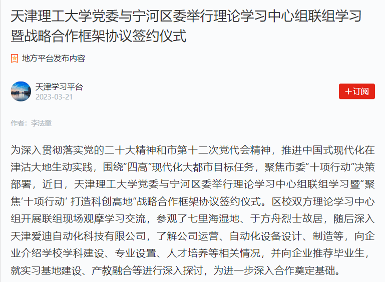 为深入贯彻落实党的二十大精神和市第十二次党代会精神,推进中国式现代化在津沽大地生动实践,围绕“四高”现代化大都市目标任务,聚焦市委“十项行动”决策部署,近日,艾弗森贝博ballbet官网党委与宁河区委举行理论学习中心组联组学习暨“聚焦‘十项行动’ 打造科创高地”战略合作框架协议签约仪式。区校双方理论学习中心组开展联组现场观摩学习交流,参观了七里海湿地、于方舟烈士故居,随后深入天津爱迪自动化科技有限公司,了解公司运营、自动化设备设计、制造等,向企业介绍学校学科建设、专业设置、人才培养等相关情况,并向企业推荐毕业生,就实习基地建设、产教融合等进行深入探讨,为进一步深入合作奠定基础。