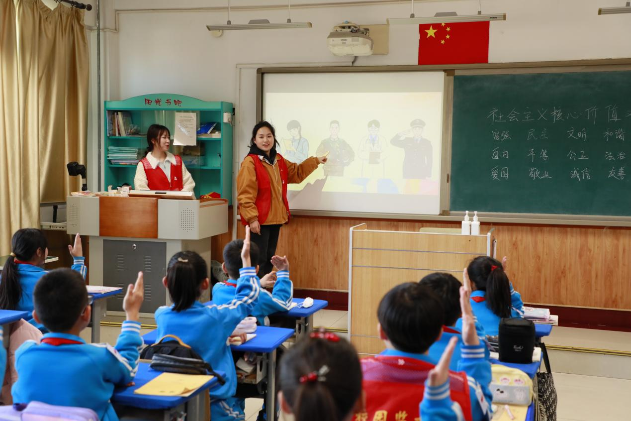 志愿者们走进河北省乐亭县第三实验小学,为六年级的同学们讲授“海洋强国”主题活动课。志愿者详细介绍航空母舰的具体布局、起飞和停机过程、建造历史,激发同学们热爱海洋、探索海洋的责任感和使命感。志愿者为小学生讲述身边的“雷锋”事迹,共同合唱《学习雷锋好榜样》,一起手工制作雷锋包,传承新时代雷锋精神。在西青区辛口镇中心小学,志愿者为小学生们带来一场生动的“美育+思政”课程“时代雷锋”,志愿者讲述雷锋同志的感人事迹和美好品德,使小学生们正确理解雷锋精神的内涵实质,又讲述了来自各行各业勇于奉献、担当作为的典型案例,让小学生们深刻认识雷锋精神的时代内涵。同时,志愿者与小学生们一起围绕雷锋故事进行绘画创作,用手中的画笔画出自己心中的雷锋形象,鼓励同学们继承雷锋精神,传承红色基因。
