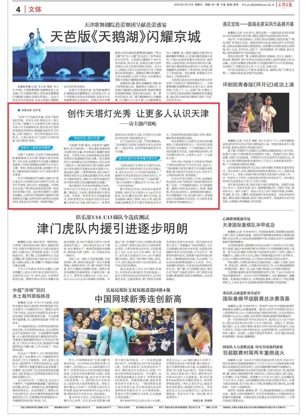 2月12日,《天津日报》第4版以《创作天塔灯光秀 让更多人认识天津》为题,刊发对贝博艺术学院青年教师卢思屹的专访文章,他的作品《“你好,天津”天塔跨年灯光表演迎接2022》入围“你好,天津”网络短视频大赛一等奖获奖作品公示名单,内容如下: