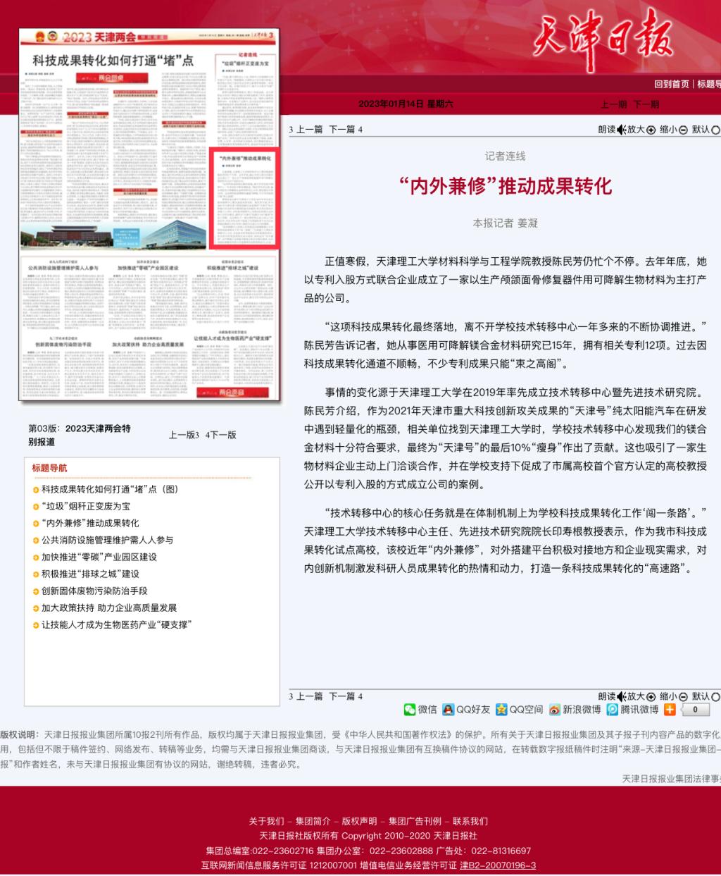 1月14日,《天津日报》第3版“2023天津两会特别报道”专版“记者连线”栏目采访贝博先进技术研究院院长印寿根和材料科学与工程学院教授陈民芳,报道学校对外搭建平台积极对接地方和企业现实需求,对内创新机制激发科研人员成果转化的热情和动力,“内外兼修”打造科技成果转化“高速路”的经验做法,内容如下: