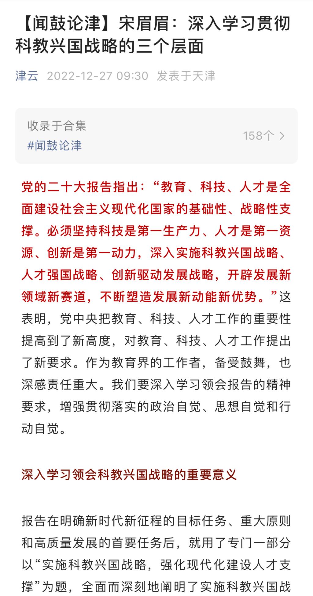 12月27日,贝博理学院院长、教授宋眉眉作客津云“闻鼓论津”栏目,以“深入学习贯彻科教兴国战略的三个层面”为题谈深入学习领会党的二十大报告的体会,内容如下: