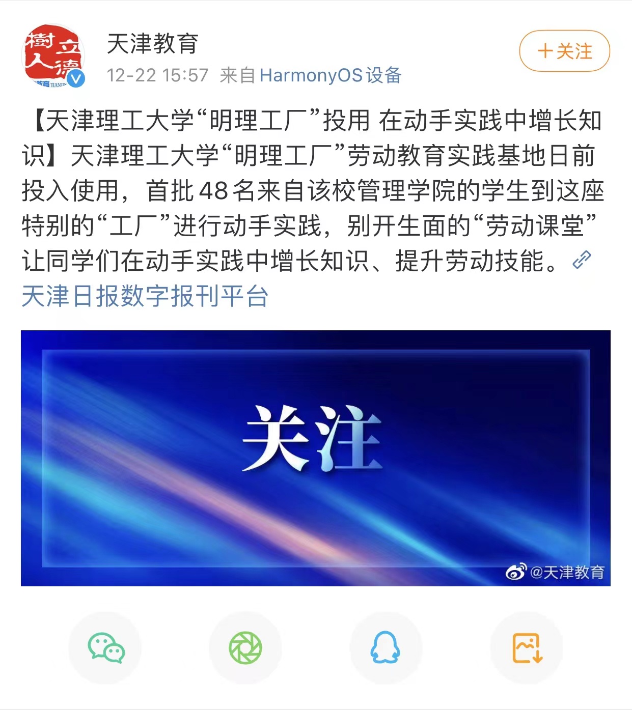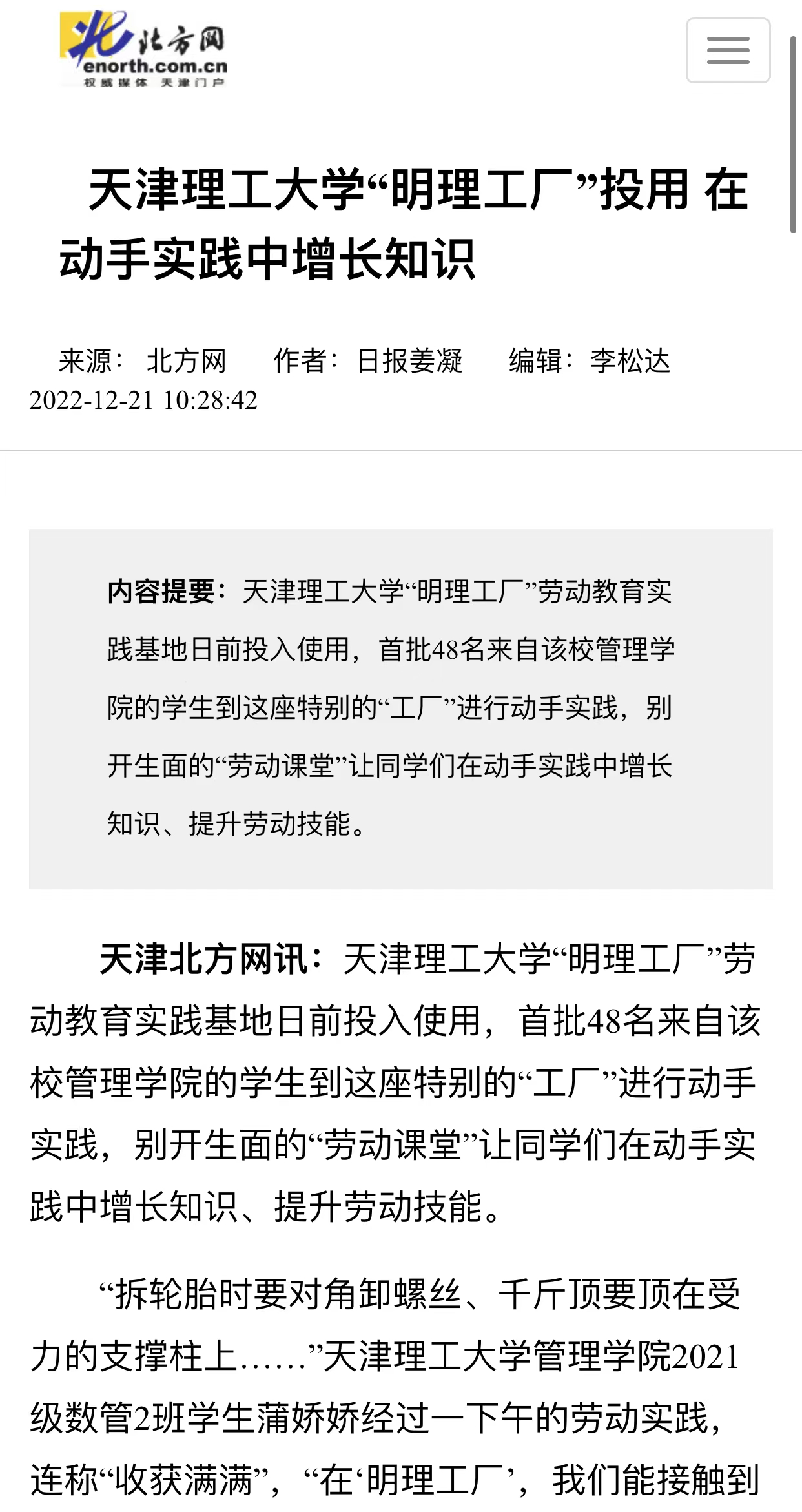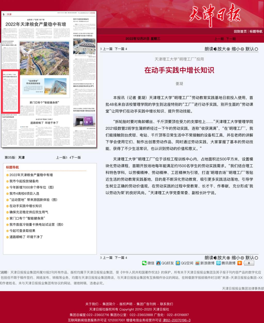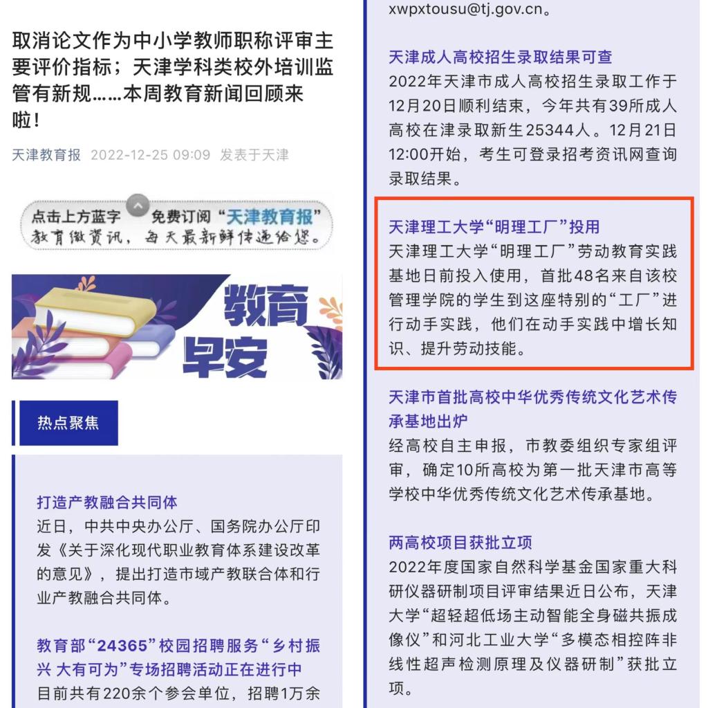 日前,学习强国、新华网、《天津日报》、北方网、天津政务网,天津教育报、天津广播微信公众号和津门教育微博等众多媒体先后关注报道贝博“明贝博厂”劳动教育实践基地投入使用,开设不锈钢艺术卡片制作、防腐木花箱制作、汽车轮胎更换等科目,打造学生劳动教育实践平台,引导学生树立正确的劳动价值观,在劳动实践的过程中受教育、长才干、作奉献的先进经验,内容如下: