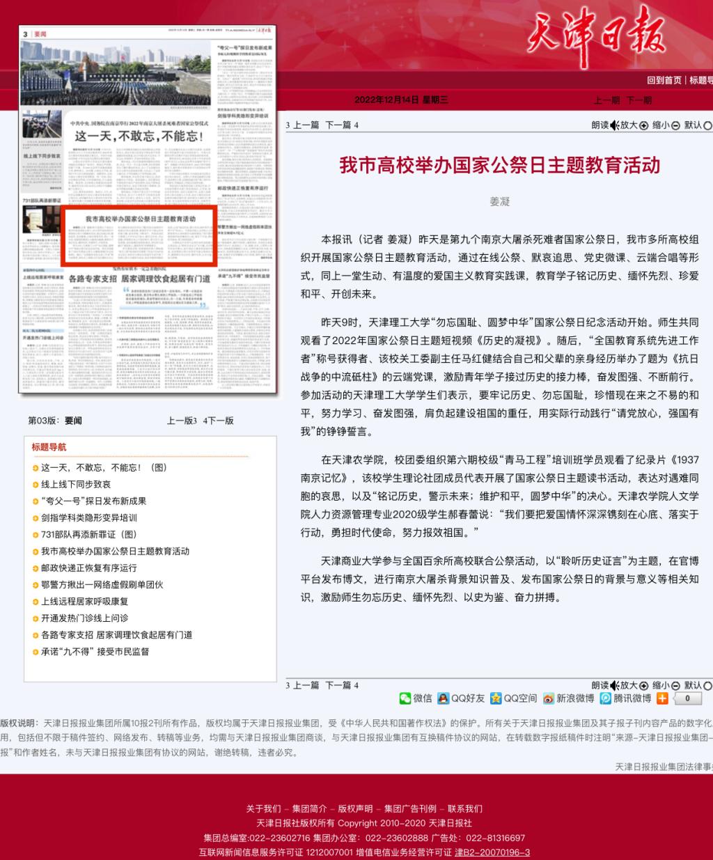 12月14日,《天津日报》在第3版报道贝博开展“勿忘国耻、圆梦中华”国家公祭日纪念活动,“全国教育系统先进工作者”称号获得者、关工委副主任马红健结合自己和父辈的亲身经历举办题为《抗日战争的中流砥柱》的云端党课,激励青年学子接过历史的接力棒,奋发图强、不断前行,内容如下: