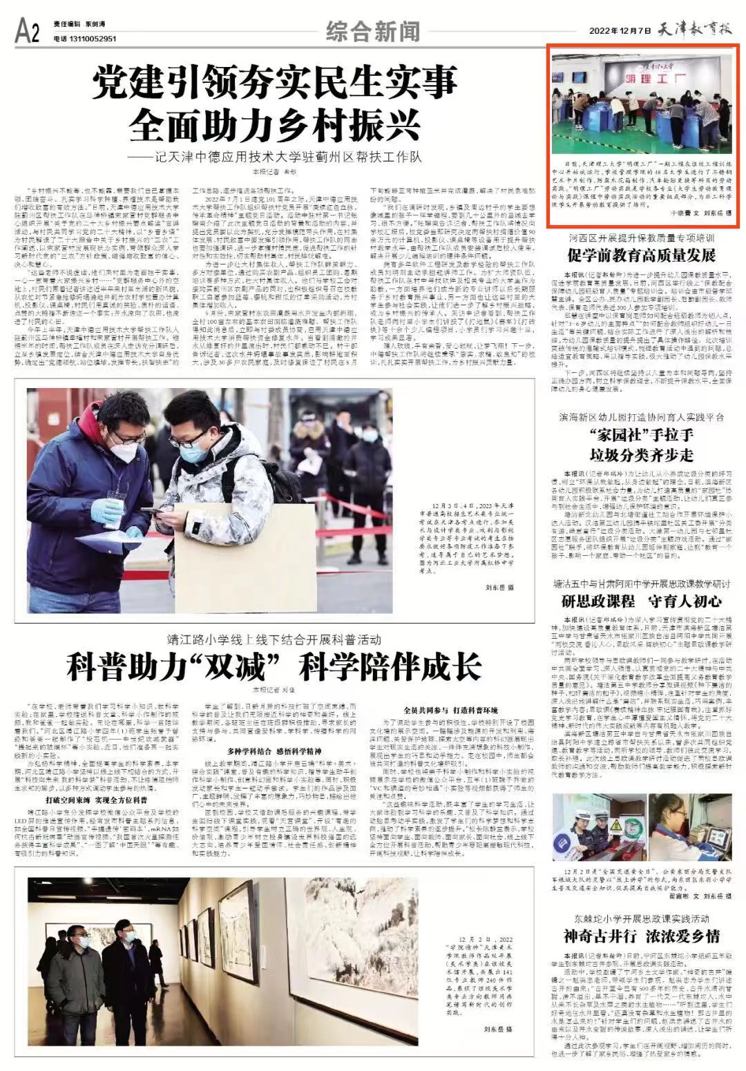 12月7日,《天津教育报》第2版图文报道贝博“明贝博厂”一期工程在工程训练中心成功试运行,开设不锈钢艺术卡片制作、防腐木花箱制作、汽车轮胎更换等科目,打造学生劳动教育实践平台的情况,内容如下: