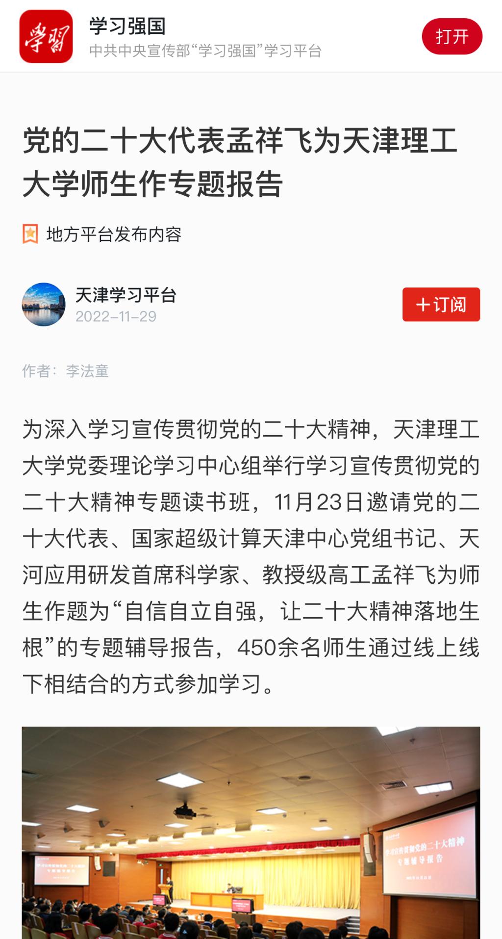 为深入学习宣传贯彻党的二十大精神,艾弗森贝博ballbet官网党委理论学习中心组举行学习宣传贯彻党的二十大精神专题读书班,11月23日邀请党的二十大代表、国家超级计算天津中心党组书记、天河应用研发首席科学家、教授级高工孟祥飞为师生作题为“自信自立自强,让二十大精神落地生根”的专题辅导报告,450余名师生通过线上线下相结合的方式参加学习。