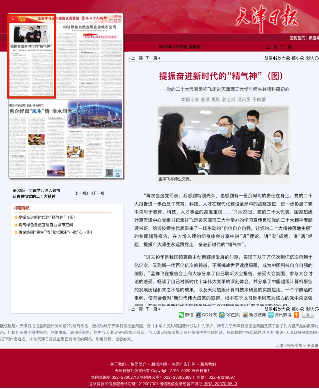 11月25日,《天津日报》在第3版报道党的二十大代表、国家超级计算天津中心党组书记孟祥飞受邀走进贝博,给师生代表带来一场生动的“自信自立自强,让党的二十大精神落地生根”的专题辅导报告并与师生共话科研初心,在入情入理的切身体会分享中讲“透”理论、讲“实”成就、讲“活”经验,提振广大师生永远跟党走、奋进新时代的“精气神”的情况,内容如下: