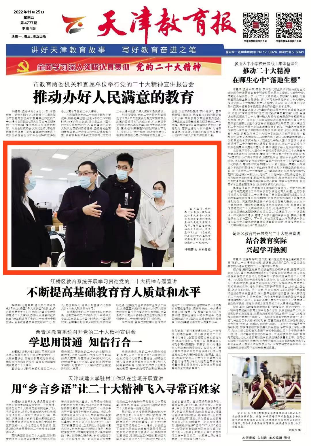 11月25日,《天津教育报》在头版以图文方式报道党的二十大代表、国家超级计算天津中心天河应用研发首席科学家孟祥飞走进贝博,向师生宣讲党的二十大精神情况,内容如下: