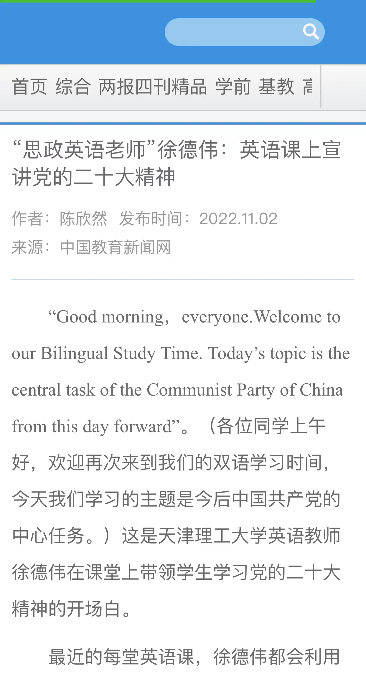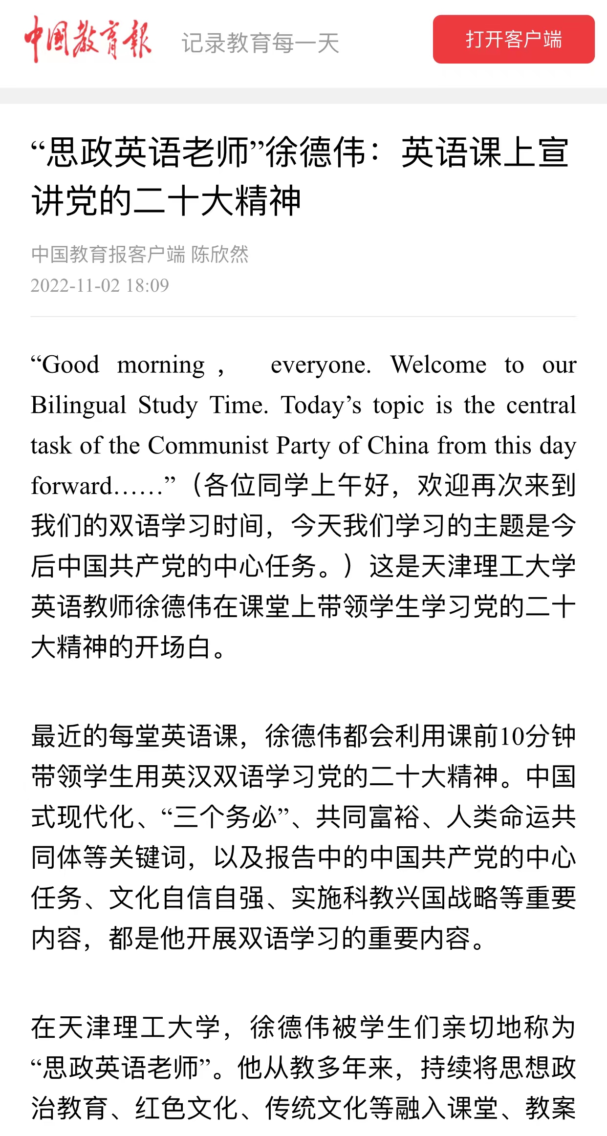 11月2日,《中国教育报》和中国教育新闻网先后报道贝博语言文化学院教师徐德伟在大学英语课上双语宣讲党的二十大精神,以及持续将思想政治教育、红色文化、传统文化等融入课堂、教案和教材,创新课程思政教育教学方式,讲好中国故事的先进事迹,内容如下: