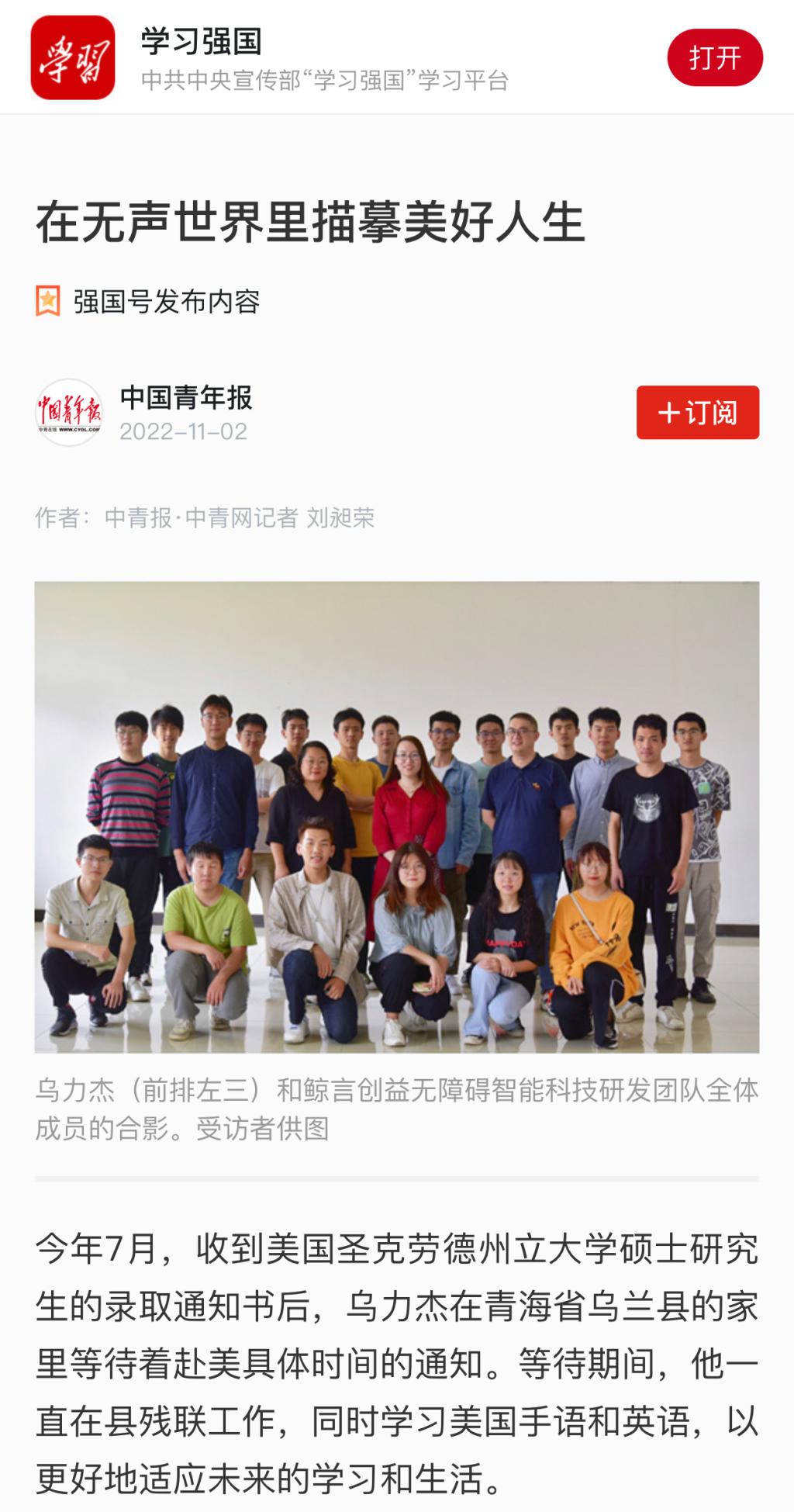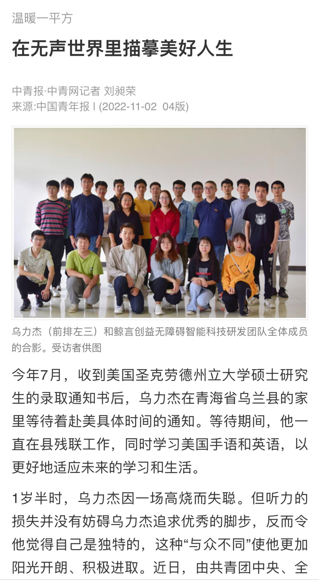 11月2日,《中国青年报》第4版、学习强国平台以“在无声世界里描摹美好人生”为题,报道2021年度“中国大学生自强之星”、贝博聋人工学院2022届计算机科学与技术专业毕业生乌力杰的青春奋进故事,内容如下: