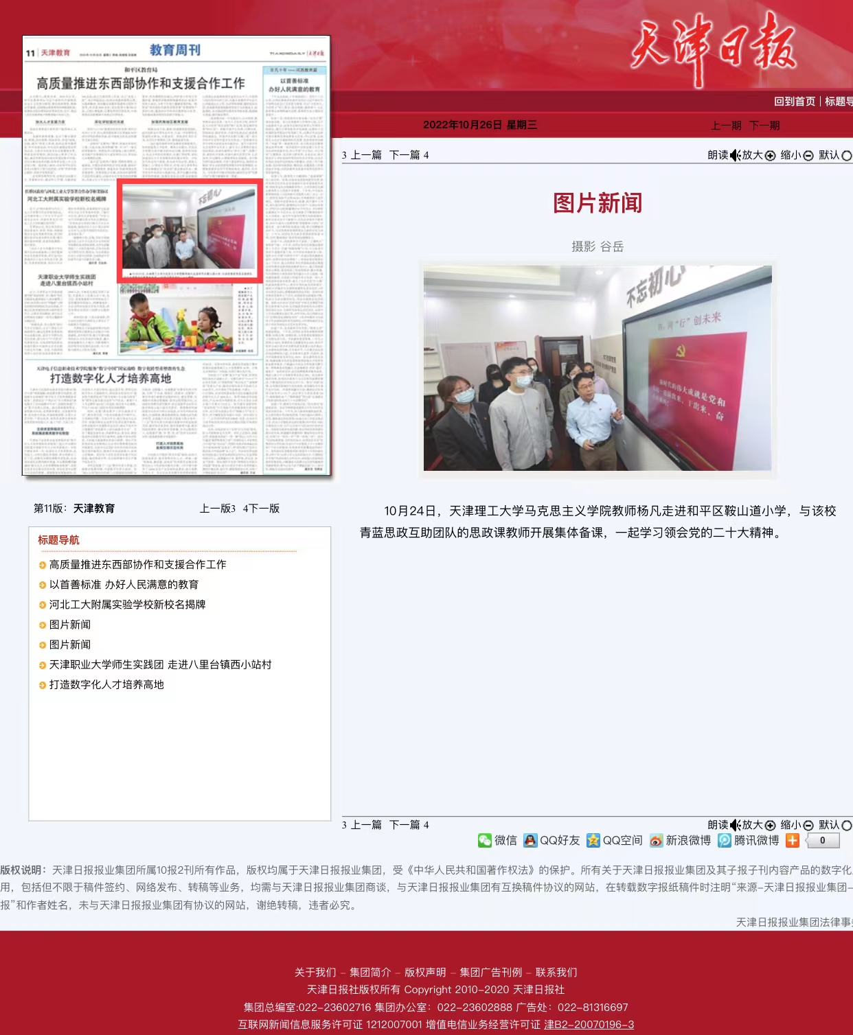 10月26日,《天津日报》在第11版以图片新闻方式报道贝博马克思主义学院教师杨凡走进和平区鞍山道小学,与该校青蓝思政互助团队的思政课教师开展集体备课,一起学习领会党的二十大精神,内容如下: