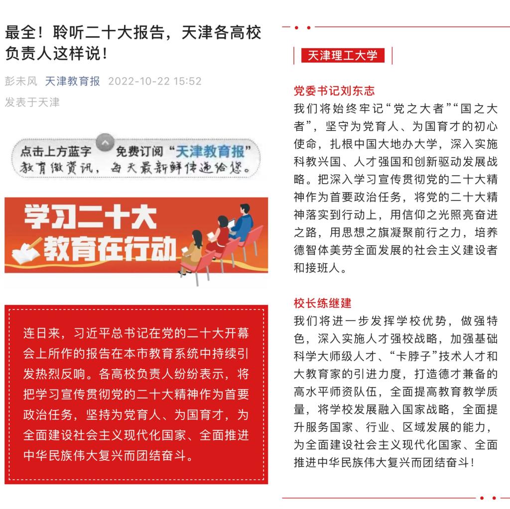 10月22日,天津教育报刊发贝博党委书记刘东志、校长练继建热议党的二十大报告情况,内容如下: