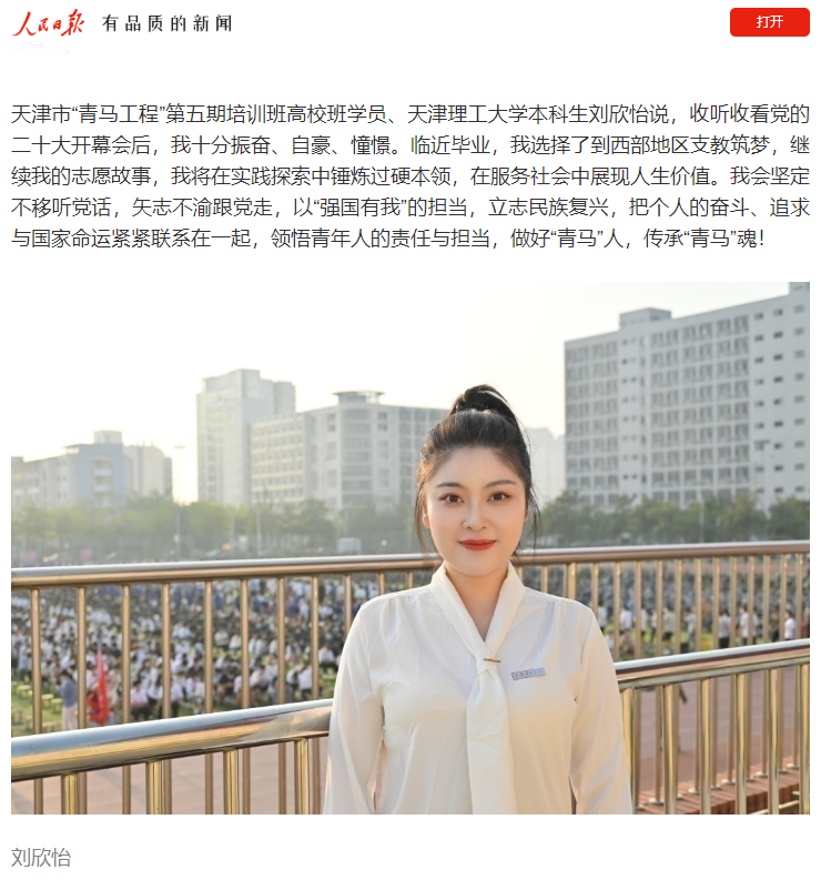 天津市“青马工程”第五期培训班高校班学员、艾弗森贝博ballbet官网本科生刘欣怡说,收听收看党的二十大开幕会后,我十分振奋、自豪、憧憬。临近毕业,我选择了到西部地区支教筑梦,继续我的志愿故事,我将在实践探索中锤炼过硬本领,在服务社会中展现人生价值。我会坚定不移听党话,矢志不渝跟党走,以“强国有我”的担当,立志民族复兴,把个人的奋斗、追求与国家命运紧紧联系在一起,领悟青年人的责任与担当,做好“青马”人,传承“青马”魂!