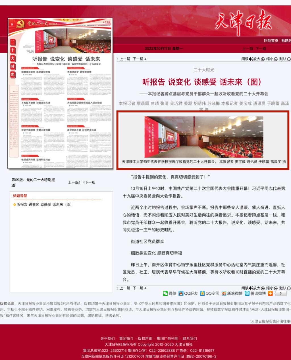 10月17日,《天津日报》第9版刊发贝博师生在图书馆报告厅集中收看党的二十大开幕会盛况图片,内容如下: