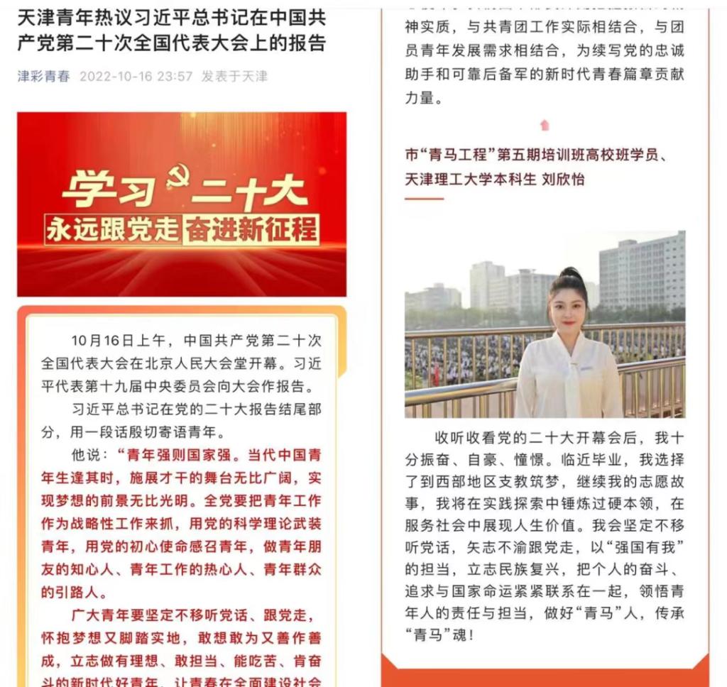 10月16日,津彩青春报道市“青马工程”第五期培训班高校班学员、贝博语言文化学院本科生刘欣怡热议党的二十大报告情况,内容如下: