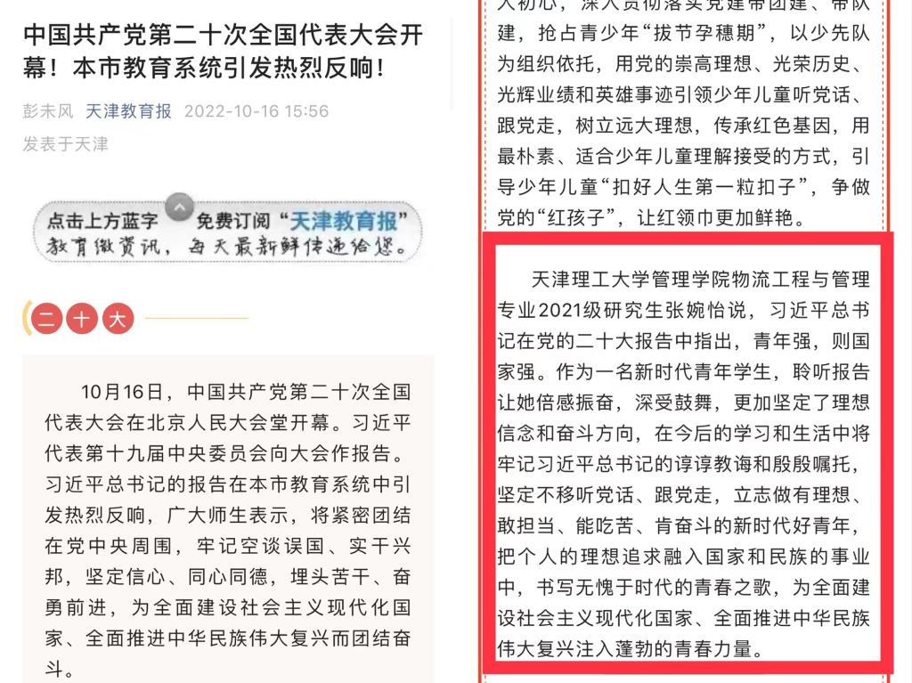 10月16日,中国共产党第二十次全国代表大会在北京人民大会堂开幕。习近平代表第十九届中央委员会向大会作报告。习近平总书记的报告在本市教育系统中引发热烈反响。当日,天津教育报公众号报道贝博管理学院物流工程与管理专业2021级研究生张婉怡热议党的二十大报告情况,内容如下: