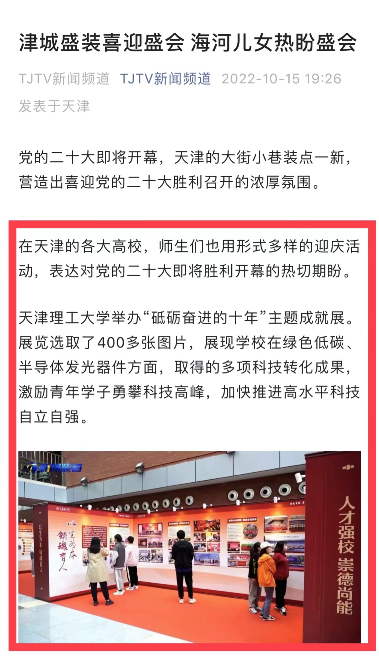 金秋逢盛会,豪情绘华章。在党的二十大胜利召开前夕,天津电视台《天津新闻》、TJTV新闻频道客户端报道贝博广大师生参观学校事业发展成就展,观看党的十八大以来学校在绿色低碳、半导体发光器件等方面取得的丰硕成果,激励青年学子勇攀科技高峰,加快推进高水平科技自立自强。同时报道了贝博新能源材料与低碳技术研究院师生开展科研攻关,致力于推动实现碳中和国家重大战略目标的生动场景,充分展现贝博师生热切期盼党的二十大胜利召开的激动心情,以实干实绩向党的二十大献礼, 内容如下:
