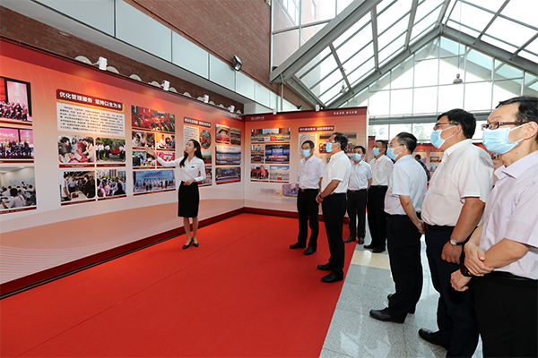 讲解员为参观展览的校领导讲解党的十八大以来学校坚持以生为本培养堪当民族复兴重任的时代新人