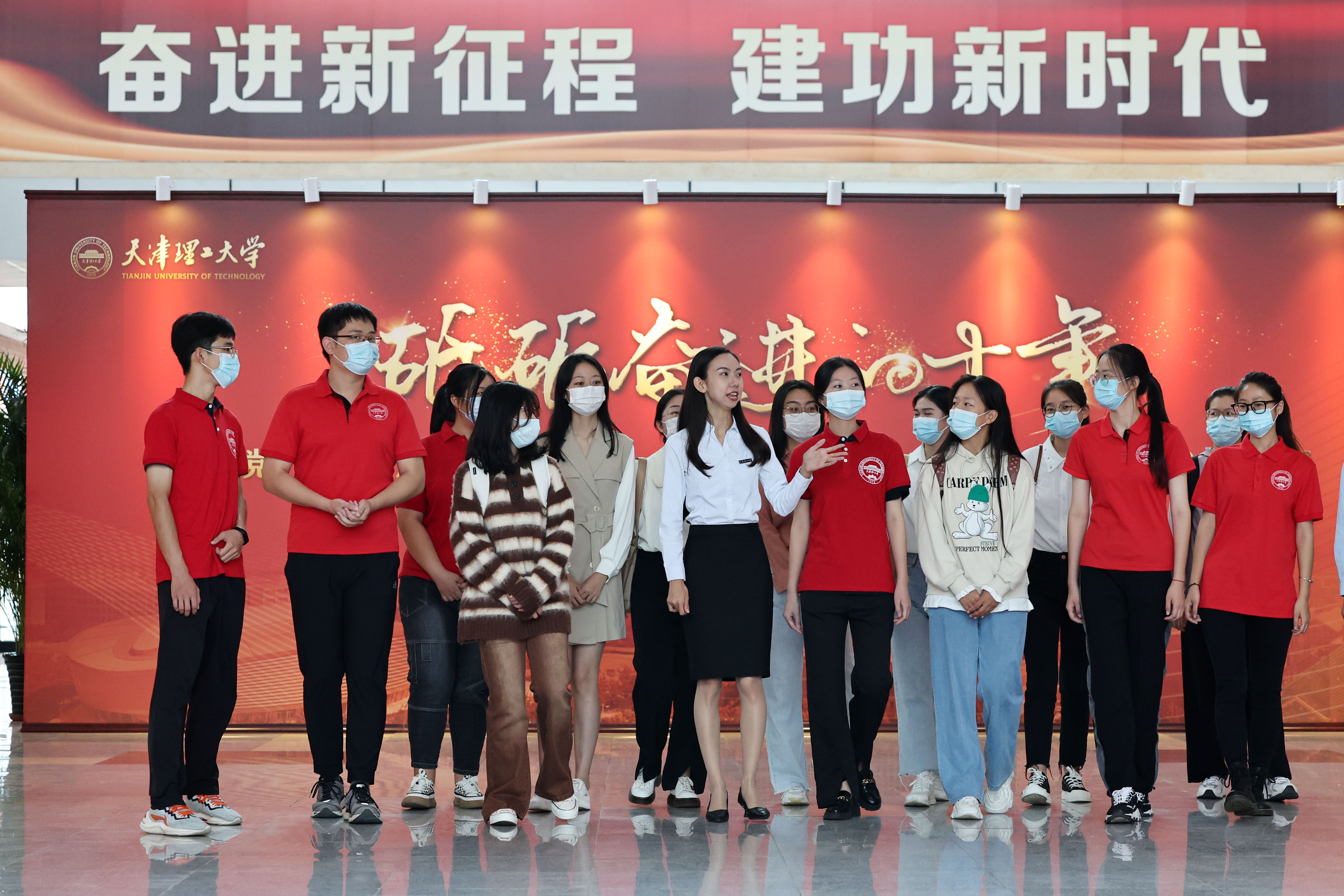 讲解员为参观展览的学生讲解党的十八大以来学校事业发展所取得的成果