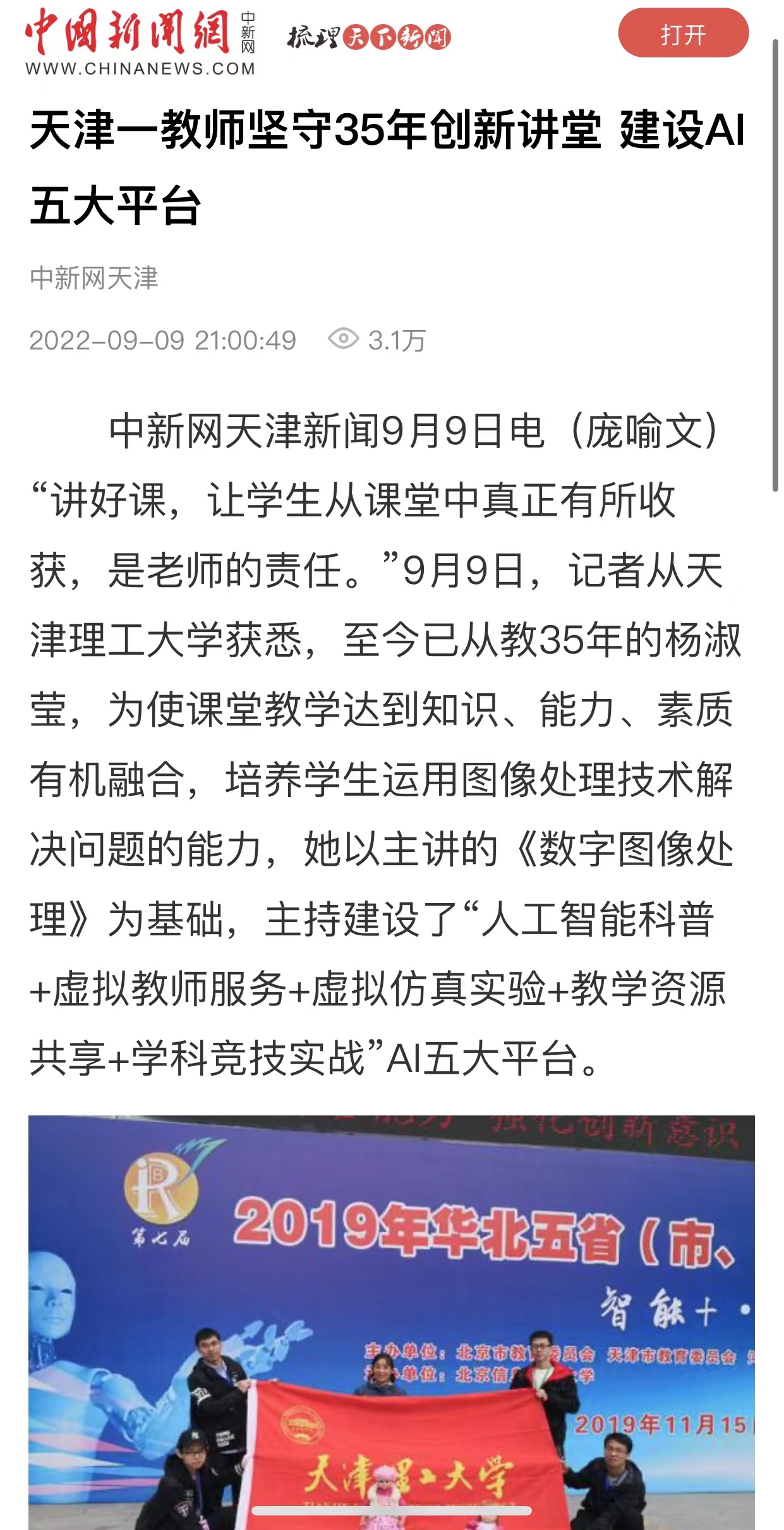 9月9日,在第38个教师节即将到来之际,中新网天津新闻报道贝博计算机科学与工程学院教授、国家级一流课程《数字图像处理》负责人杨淑莹,从教35年坚守讲台尚创新,甘当红烛育英才的教育故事,内容如下: