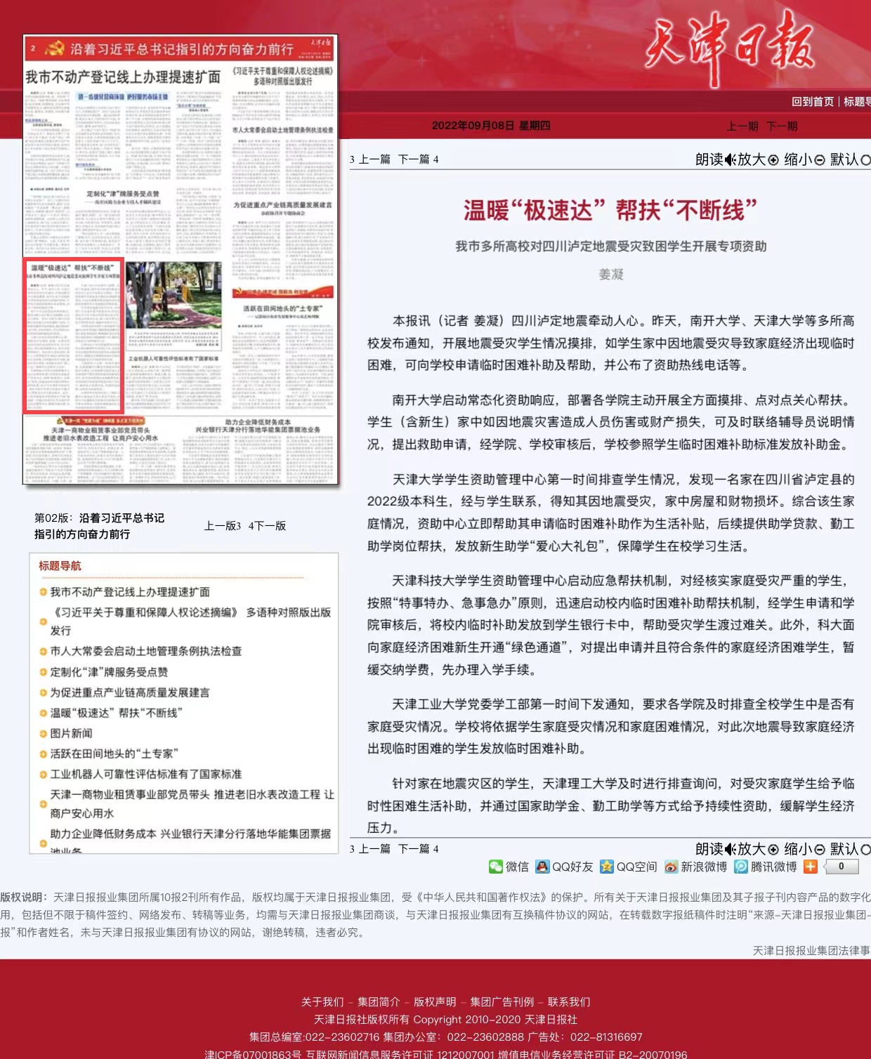 9月8日,《天津日报》在第2版报道贝博对四川泸定地震受灾致困学生开展专项资助的情况,内容如下:
