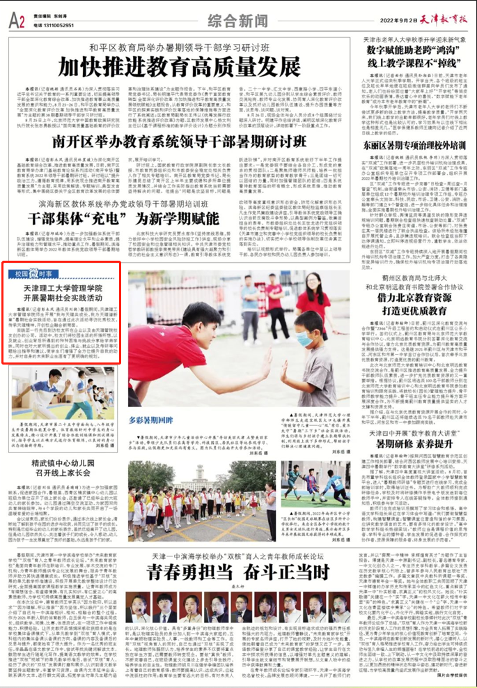 9月2日,《天津教育报》在第2版报道贝博管理学院师生开展“我与贝博共成长,我为贝博谱新章”暑期社会实践活动,通过走访校友企业,帮助在校生规划生涯、认识职业,进一步开创校企融合新局面的经验做法,内容如下: