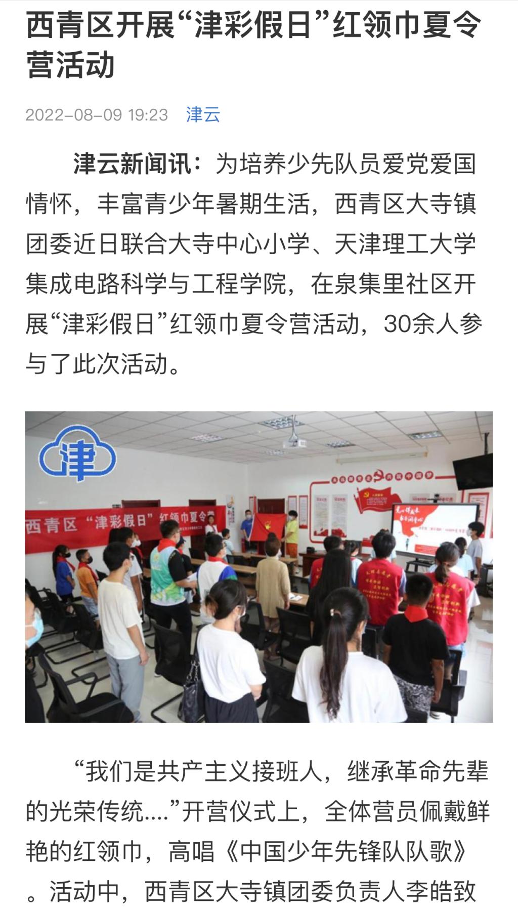 日前,津云客户端报道贝博集成电路科学与工程学院联合西青区大寺镇团委、大寺中心小学在泉集里社区开展“津彩假日”红领巾夏令营活动,培养少先队员爱党爱国情怀,丰富青少年暑期生活,内容如下:
