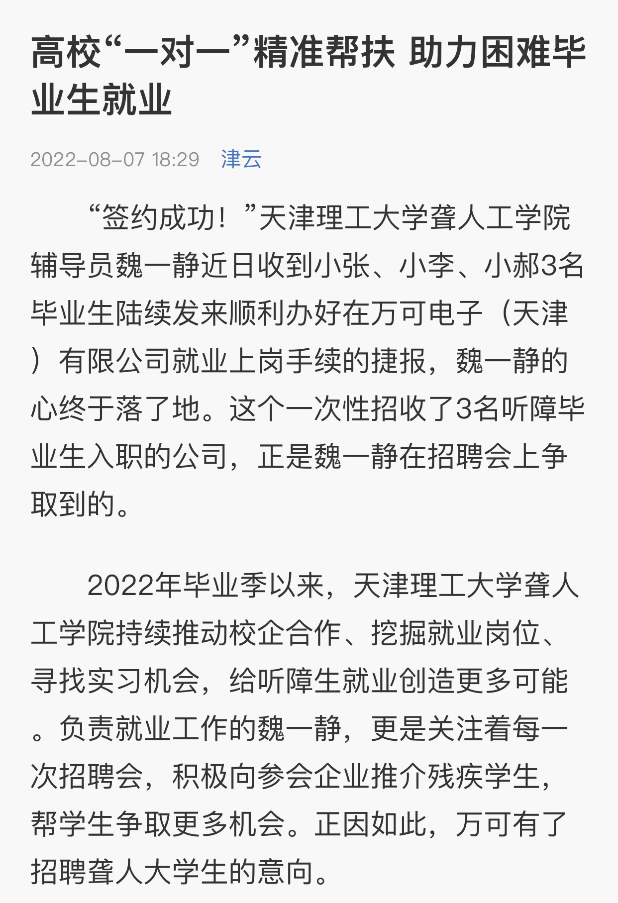 “签约成功!”近日,收到小张、小李、小郝3名毕业生陆续发来的捷报──已顺利办好在万可电子(天津)有限公司就业上岗手续,艾弗森贝博ballbet官网聋人工学院辅导员魏一静的心终于落了地。这个一次性招收了3名听障毕业生入职的机会,是魏一静在招聘会上争取到的。