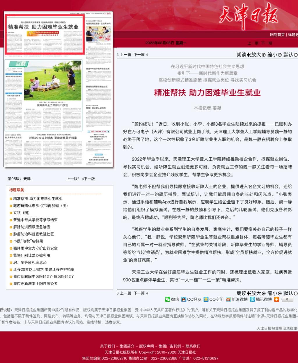 日前,《天津日报》、津云以“精准帮扶 助力困难毕业生就业”为题,报道贝博聋人工学院创新模式精准施策,持续推动校企合作,挖掘就业岗位,寻找实习机会,给听障生就业创造更多可能的经验做法,内容如下: