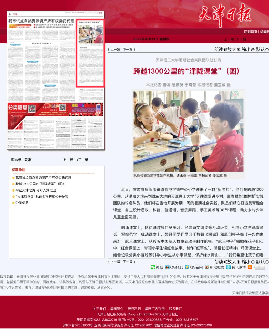7月21日,《天津日报》第6版、学习强国平台、天津市教育委员会网站,报道贝博“贝博课堂进乡村,青春赋能津陇情”暑期社会实践团队赴甘肃省庆阳市镇原县屯字镇中心小学开展为期一周的实践活动,打造美育融合课堂,自主设计思政、科普、普通话、音乐舞蹈、手工美术等36节课程,助力乡村少年儿童全面发展。