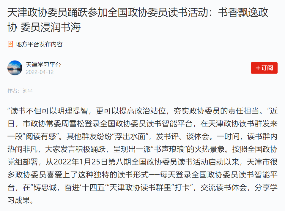 学习强国——天津政协委员踊跃参加全国政协委员读书活动:书香飘逸政协 委员浸润书海