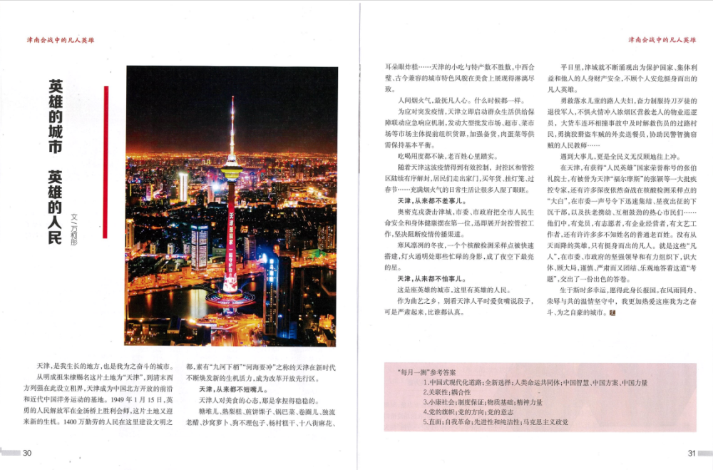 在天津,有获得“人民英雄”国家荣誉称号的张伯礼院士,有被誉为天津“福尔摩斯”的张颖等一大批疾控专家,还有许多深夜依然奋战在核酸检测采样点的“大白”,在市委一声号令下迅速集结、星夜出征的下沉干部,以及扶老携幼、互相鼓劲的热心市民们……他们中,有党员,有志愿者,有企业经营者,有文艺工作者,还有许许多多不知姓名的普通老百姓。没有从天而降的英雄,只有挺身而出的凡人。就是这些“凡人”,在市委、市政府的坚强领导和有力组织下,识大体、顾大局,谨慎、严肃而又团结、乐观地答着这道“考题”,交出了一份出色的答卷。