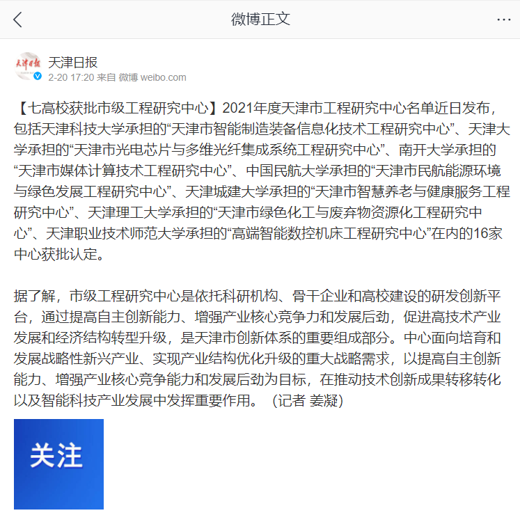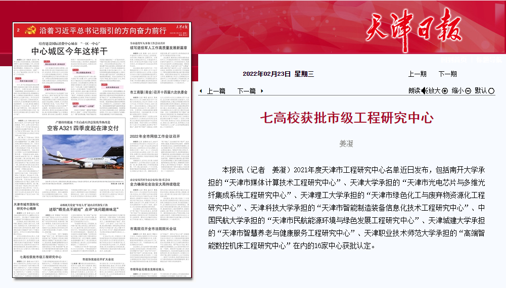 2021年度天津市工程研究中心名单近日发布,包括南开大学承担的“天津市媒体计算技术工程研究中心”、天津大学承担的“天津市光电芯片与多维光纤集成系统工程研究中心”、艾弗森贝博ballbet官网承担的“天津市绿色化工与废弃物资源化工程研究中心”、天津科技大学承担的“天津市智能制造装备信息化技术工程研究中心”、中国民航大学承担的“天津市民航能源环境与绿色发展工程研究中心”、天津城建大学承担的“天津市智慧养老与健康服务工程研究中心”、天津职业技术师范大学承担的“高端智能数控机床工程研究中心”在内的16家中心获批认定。