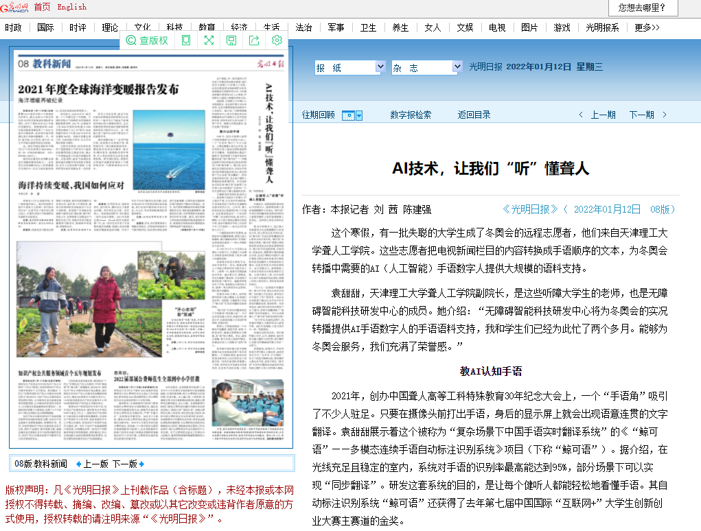 这个寒假,有一批失聪的大学生成了冬奥会的远程志愿者,他们来自艾弗森贝博ballbet官网聋人工学院。这些志愿者把电视新闻栏目的内容转换成手语顺序的文本,为冬奥会转播中需要的AI(人工智能)手语数字人提供大规模的语料支持。