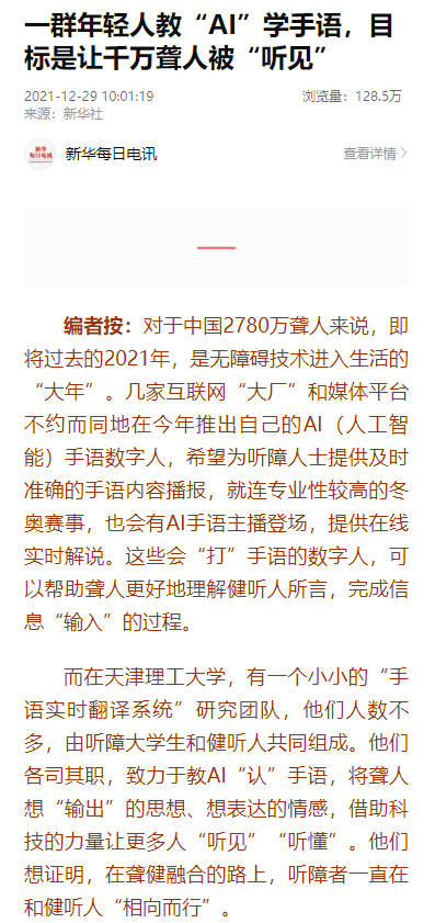 对于袁甜甜和她的团队来说,2019年和2021年是两个关键的时间节点。2019年,是他们的初创之年,“手语实时翻译系统”入选国家工信部新一代人工智能产业创新揭榜项目,获得了2000万的资金支持。袁甜甜很高兴,一方面是因为国家对无障碍建设的重视让她欣慰,另一方面,数据采集、技术研发、成果落地也确实是处处都要花钱。