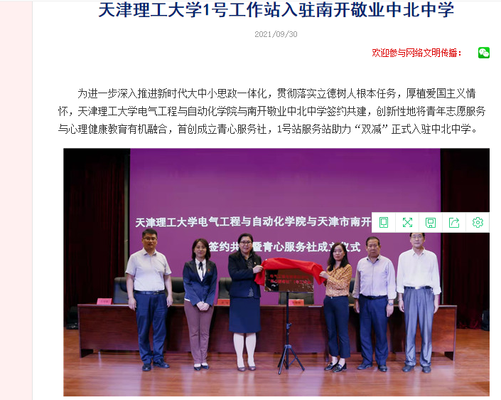为进一步深入推进新时代大中小思政一体化,贯彻落实立德树人根本任务,厚植爱国主义情怀,艾弗森贝博ballbet官网电气工程与自动化学院与南开敬业中北中学签约共建,创新性地将青年志愿服务与心理健康教育有机融合,首创成立青心服务社,1号站服务站助力“双减”正式入驻中北中学。