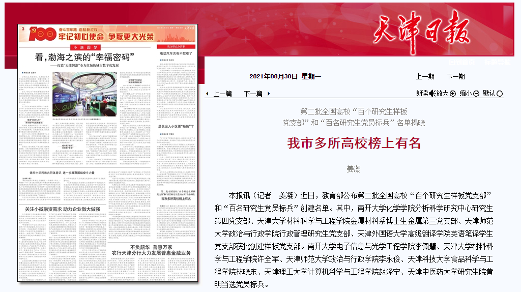 近日,教育部公布第二批全国高校“百个研究生样板党支部”和“百名研究生党员标兵”创建名单。其中,南开大学化学学院分析科学研究中心研究生第四党支部、天津大学材料科学与工程学院金属材料系博士生金属第三党支部、天津师范大学政治与行政学院行政管理研究生党支部、天津外国语大学高级翻译学院英语笔译学生党支部获批创建样板党支部。南开大学电子信息与光学工程学院李佩慧、天津大学材料科学与工程学院许全军、天津师范大学政治与行政学院李永俊、天津科技大学食品科学与工程学院林晓东、艾弗森贝博ballbet官网计算机科学与工程学院赵泽宁、天津中医药大学研究生院黄明当选党员标兵。