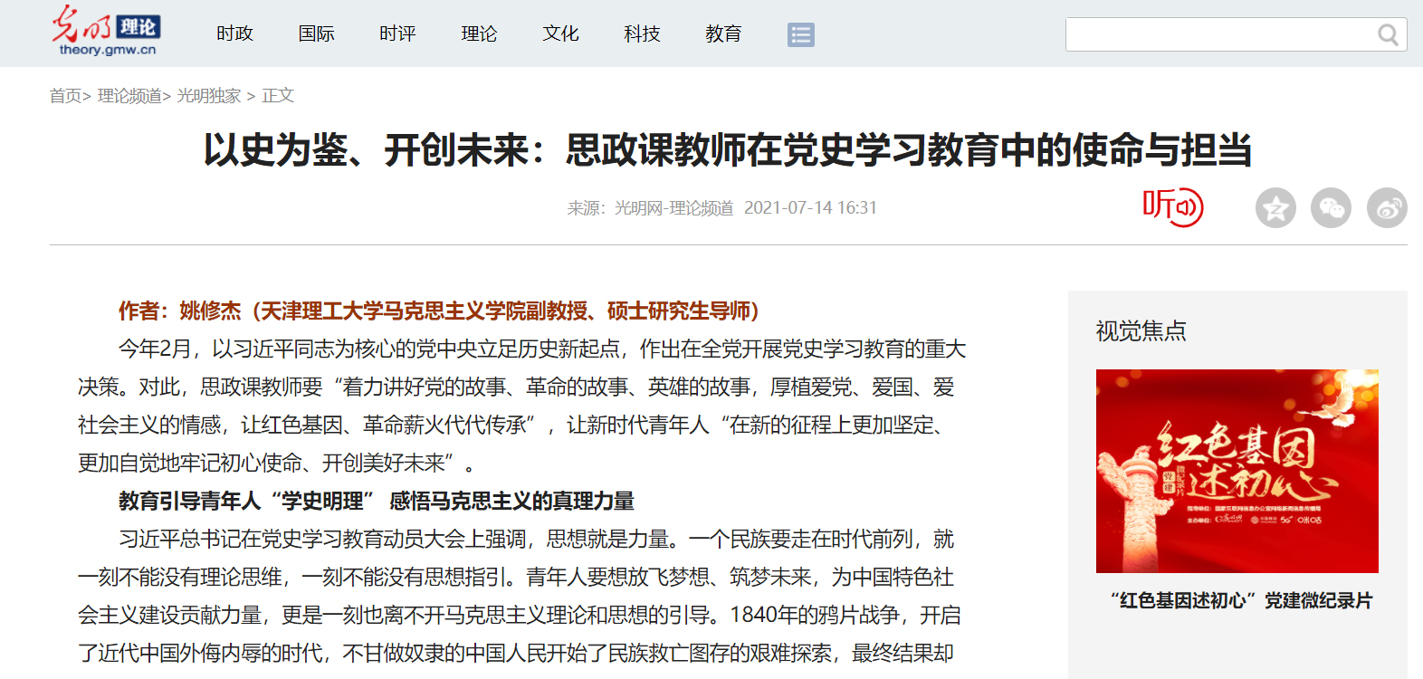 以史为鉴、开创未来,做好青年人的党史学习教育工作是思政课教师的使命与担当,青年人只有“用历史映照现实、远观未来,从中国共产党的百年奋斗中看清楚过去我们为什么能够成功,弄明白未来我们怎么继续成功”,才能顺利成长为新时代中华民族伟大复兴的主力军,才能在“奋斗中释放青春激情、追逐青春理想,以青春之我、奋斗之我,为民族复兴铺路架桥,为祖国建设添砖加瓦”。