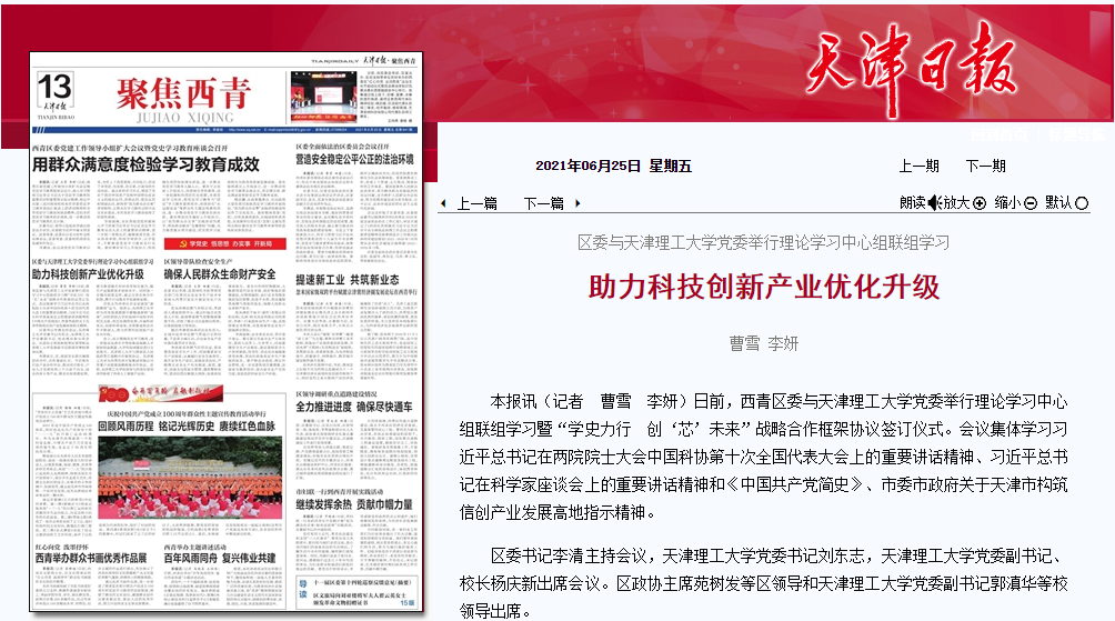 李清表示,区、校双方长期开展深层次合作,合作基础扎实。今后将在打造产业合作平台、推动项目转化、产业人才交流培养三个方面下功夫,结合西青主导产业,整合区校资源优势,着力推进提升科研项目转化能力,提升产业集群技术创新水平。同时进一步强化政策支持,建立完善长效合作机制,携手开启高水平发展新征程。