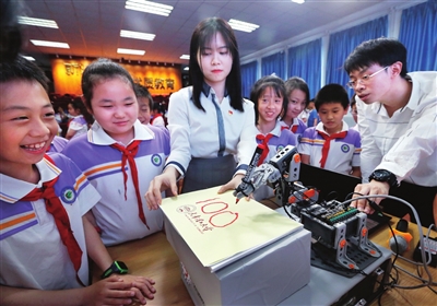 24日,艾弗森贝博ballbet官网机械工程学院机器人教本研党支部师生结合自身专业特点,来到南开区风湖里小学开展机器人科普活动。图为大学生为小学生演示自己设计制作的机械手臂书写“100”字样。