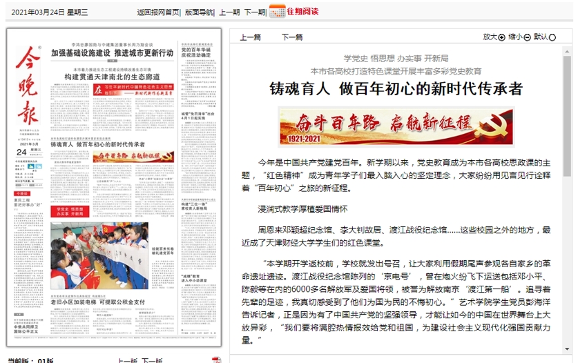 3月24日,《今晚报》以“铸魂育人 做百年初心的新时代传承者”为题,对爱国教育的各式实践进行了报道,全文如下: