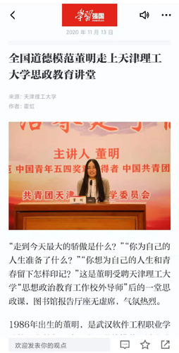 近日,《学习强国》以“全国道德模范董明走上艾弗森贝博ballbet官网思政教育讲堂”为题,对这堂特殊的思政课进行了报道,全文如下: