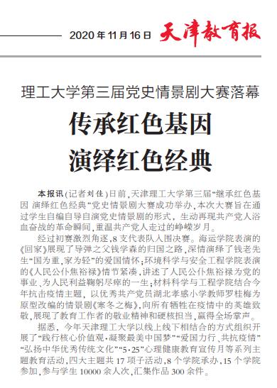 11月16日出版的《天津教育报》第二版刊发贝博“贝博大学第三届党史情景剧大赛落幕”新闻。全文如下:
