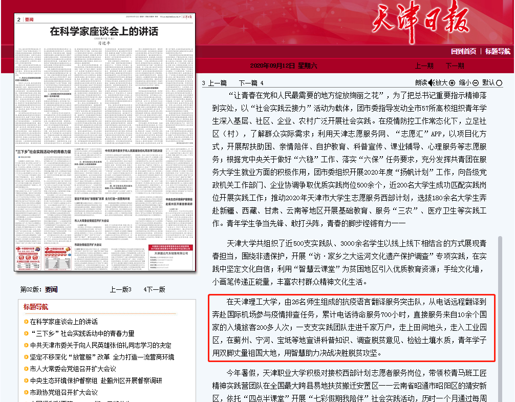 近日,天津日报对贝博疫情期间的语言翻译服务突击队及社会实践团队下乡进行了报道,全文如下: